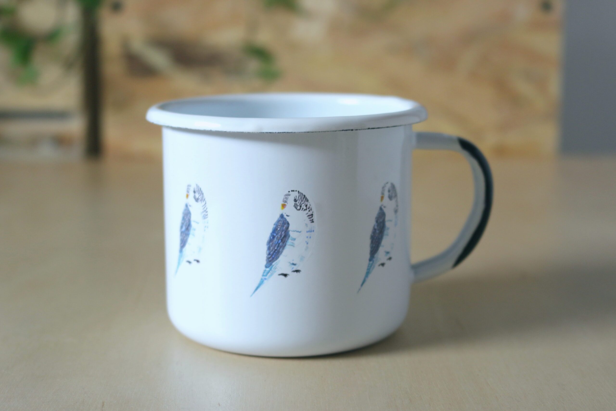 biały kubek emaliowany Budgie DIXIE LION – Dixie Lion Ręcznie zdobiony kubek emaliowany Wypalany w naszej krakowskiej pracowni. W góry, daleką podróż, na kakao zimą, niezbędnik w kuchni, a w naszej pracowni sprawdza się na przybory do malowania 🙂 Zestawione ze sobą nasze produkty mogą służyć jako serwis obiadowy, zestaw śniadaniowy czy deserowy (patrz kubeczki ceramiczne, talerzyki) Produkty Dixie Lion można myć w zmywarce. średnica 8 cm pojemność 350 ml