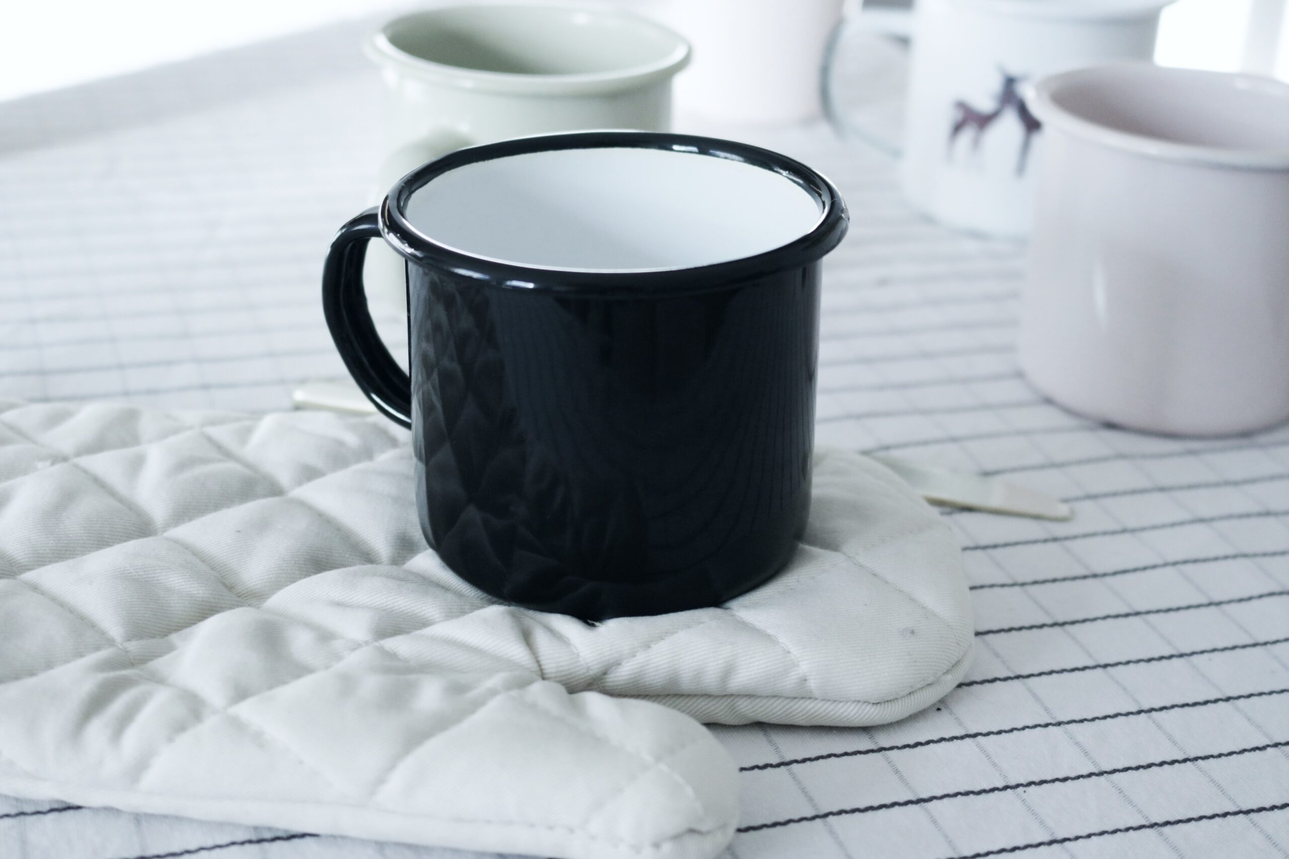 Kubek emaliowany w kolorze czarnym, w którym ilość ozdób ograniczona jest do jednego logo. Idealnie wpasowuje się w minimalistyczne wnętrze w którym nie może zabraknąć surowych w prostocie naczyń. Eleganckie i niezwykle funkcjonalne kojarzące się z ciepłem babcinego domu, w przepięknych stonowanych kolorach pantone, posłużą nam do podania herbaty przy kominku jak i do podgrzania wody…