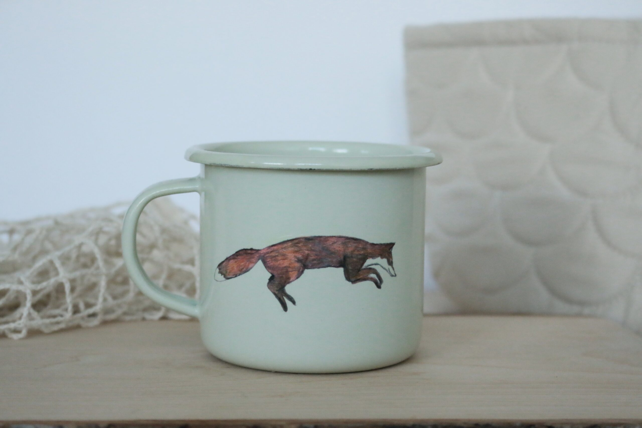 Ręcznie zdobiony kubek emaliowany w przepięknym, robionym na zamówienie leśnym kolorze Light Moss. Emalia bardzo wysokiej jakości produkcji polskiej. Wypalany w naszej krakowskiej pracowni. W góry, daleką podróż, na kakao zimą, niezbędnik w kuchni, a w naszej pracowni sprawdza się na przybory do malowania 🙂 średnica ok 8 cm , pojemność ok 320 ml