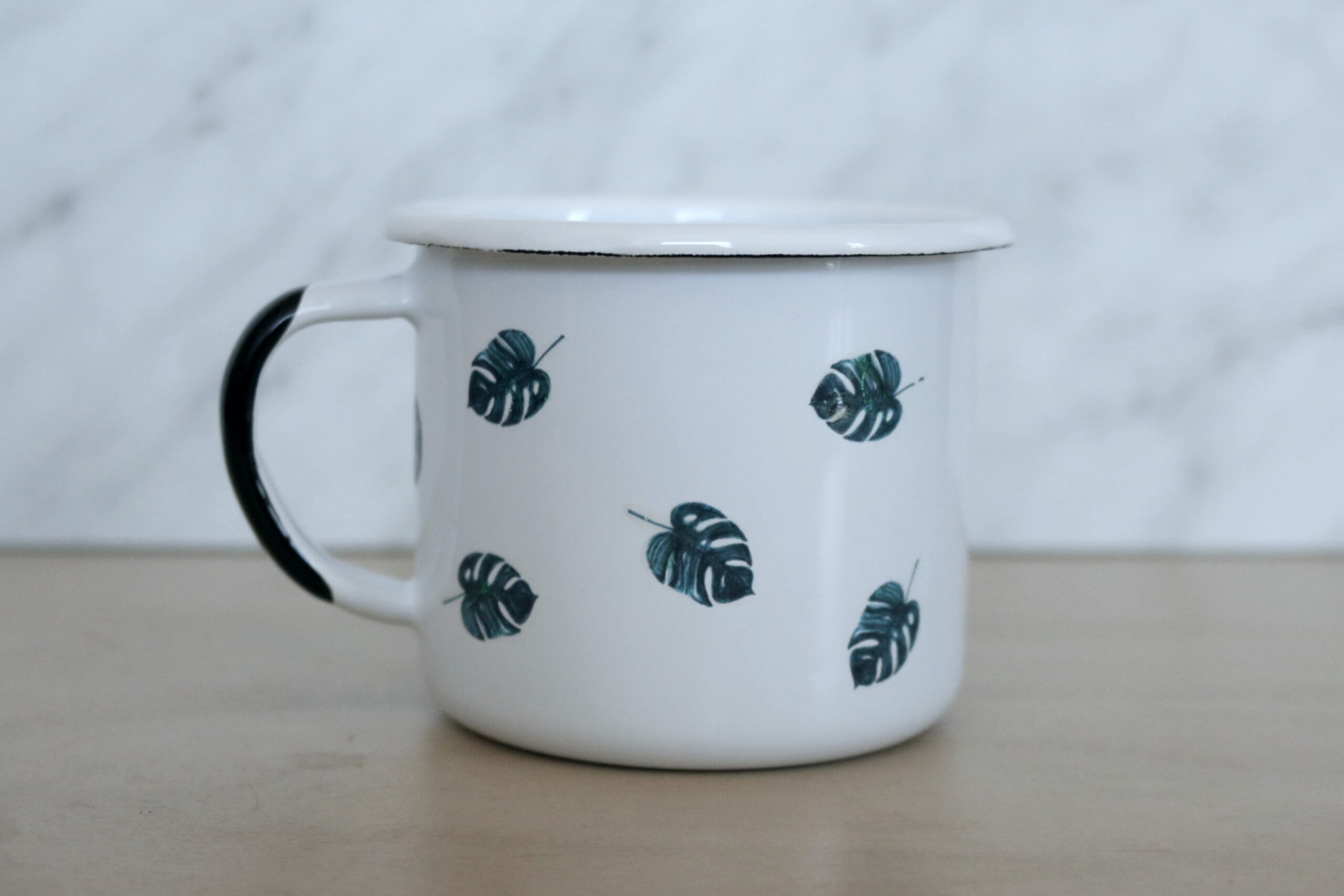 kubek emaliowany MONSTERA WHITE DIXIE LION garnek – Dixie Lion Biały,ręcznie malowany i zdobiony kubek emaliowany z czarnym uchem. Emalia bardzo wysokiej jakości produkcji polskiej. Wypalany w naszej krakowskiej pracowni. W góry, daleką podróż, na kakao zimą, niezbędnik w kuchni, a w naszej pracowni sprawdza się na przybory do malowania 🙂 średnica ok 8,5cm, pojemność 0,35L