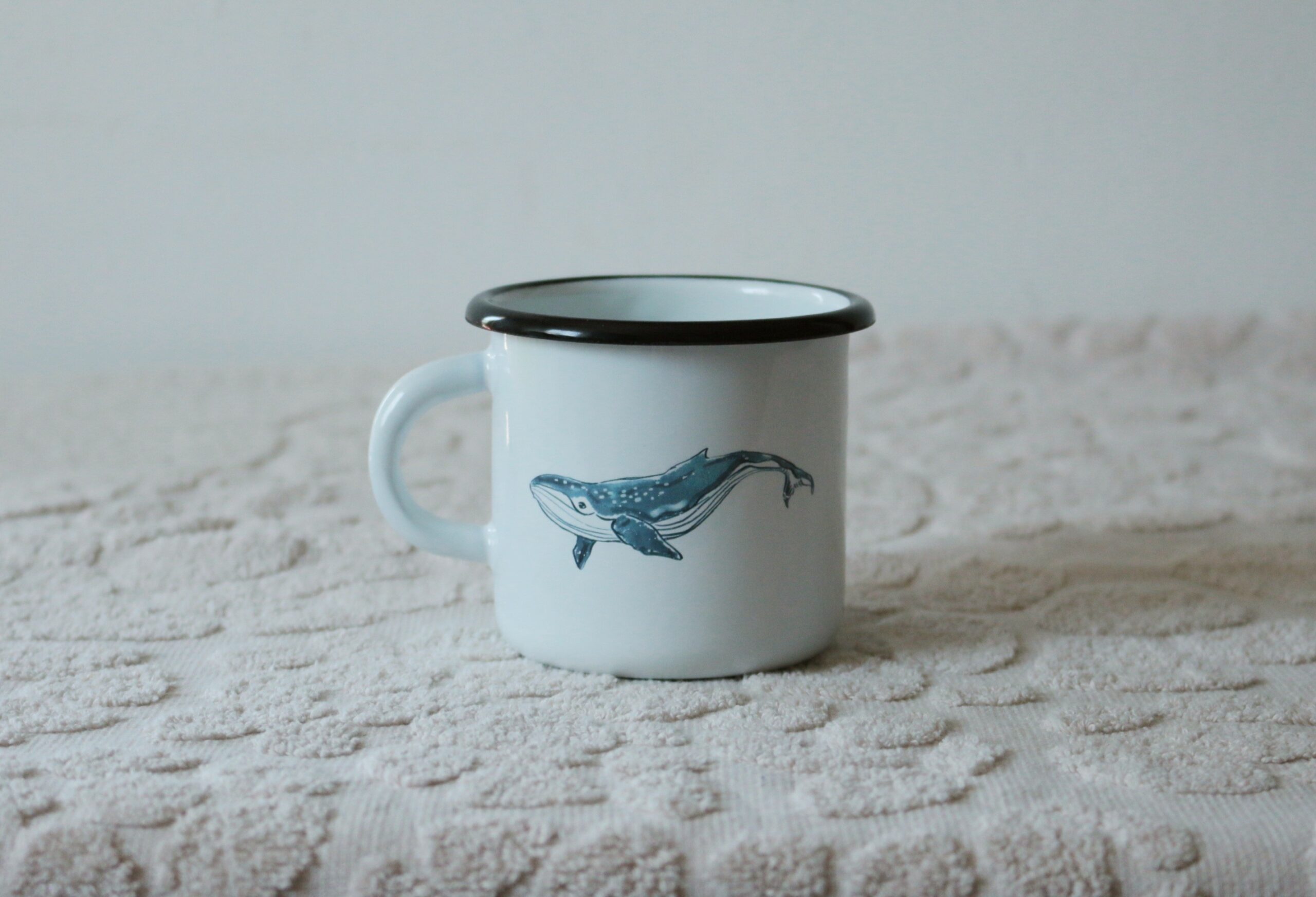Ręcznie zdobiony  kubek emaliowany z wielorybkiem. Emalia bardzo wysokiej jakości. Dekorowany i wypalany w naszej krakowskiej pracowni. W góry, daleką podróż, na kakao zimą, niezbędnik w kuchni do małego gotowania (np jajek na miękko) mniej tłukący niż porcelana i nadający się na wszystkie kuchenki (w tym indukcyjną również!)  średnica ok 8 cm , pojemność ok 400 ml