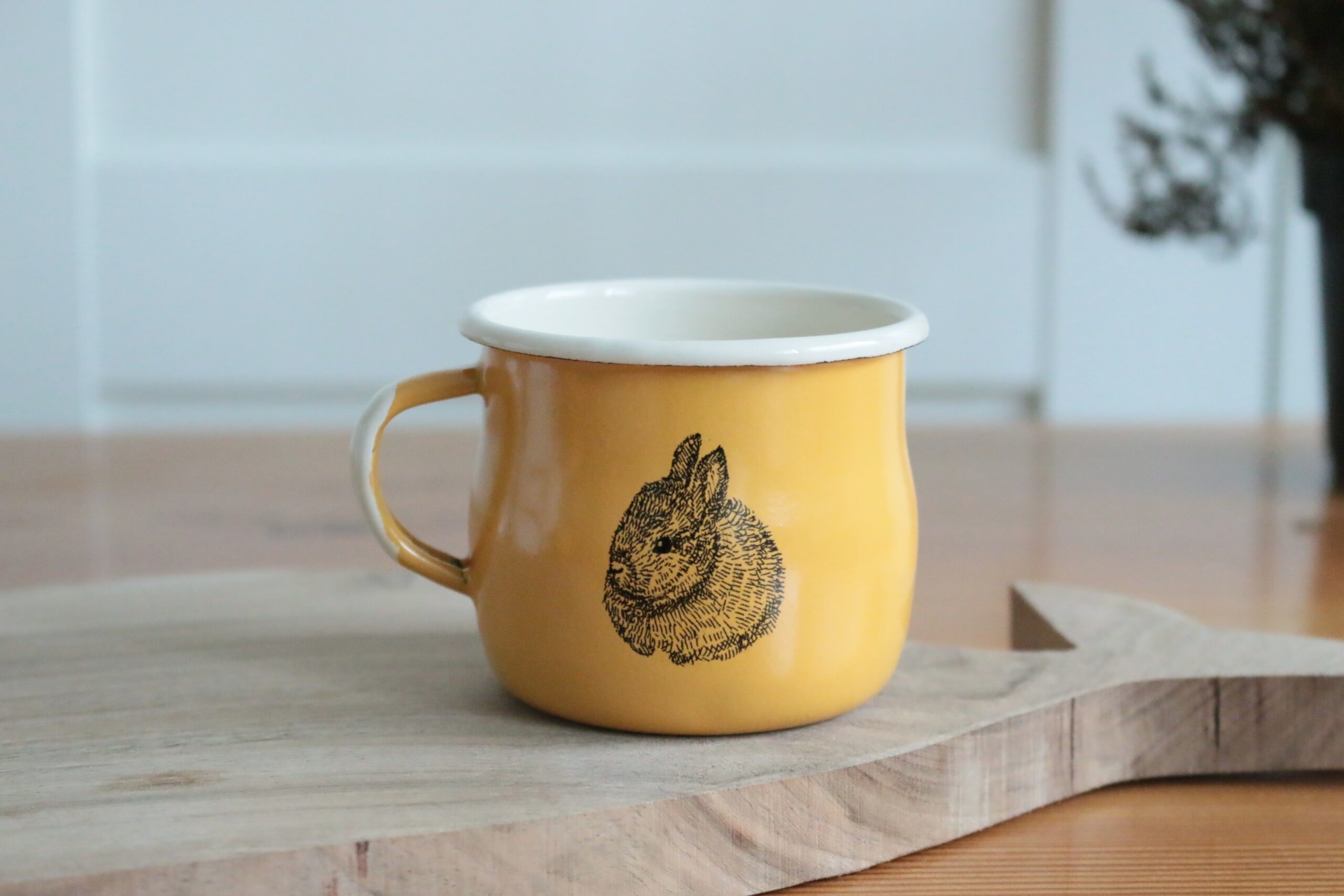 kubek emaliowany z króliczkiem w kolorze bumblebee. Ręcznie zdobiony mały kubek emaliowany z białym uchem. Emalia bardzo wysokiej jakości produkcji polskiej. Wypalany w naszej krakowskiej pracowni. W góry, daleką podróż, na kakao zimą, niezbędnik w kuchni, a w naszej pracowni sprawdza się na przybory do malowania 🙂 standardowy około 250ml