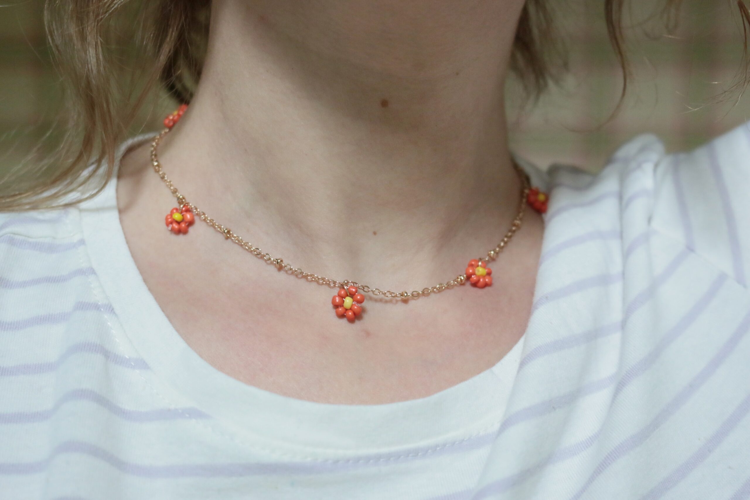 Pomarańczowy naszyjnik ze stokrotkami. Zrobiony skrupulatnie z maleńkich koralików i nici. Zapakowany w śliczne pudełko z aksamitną poduszeczką. Piękny prezent i wysokiej klasy biżuteria tylko od Poppy Cox