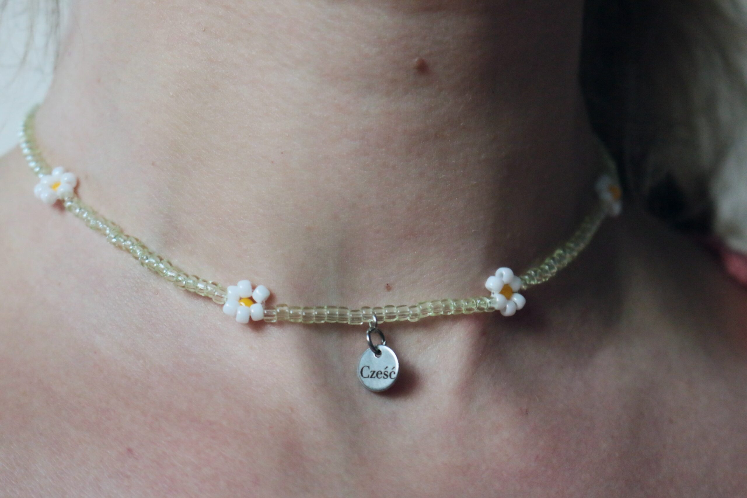 Stokrotkowy naszyjnik z maleńkich koralików z napisem 'Cześć’ Piękne kółeczko na delikatnym łańcuszku w kolorze złotym z wygodnym zapięciem, od początku do końca robiony i grawerowany ręcznie. Stokrotki pakujemy w urocze dixielionowe ekologiczne pudełeczko wyścielone aksamitną gąbką. Polecamy z całego serca dla Ciebie jak również na prezent <3