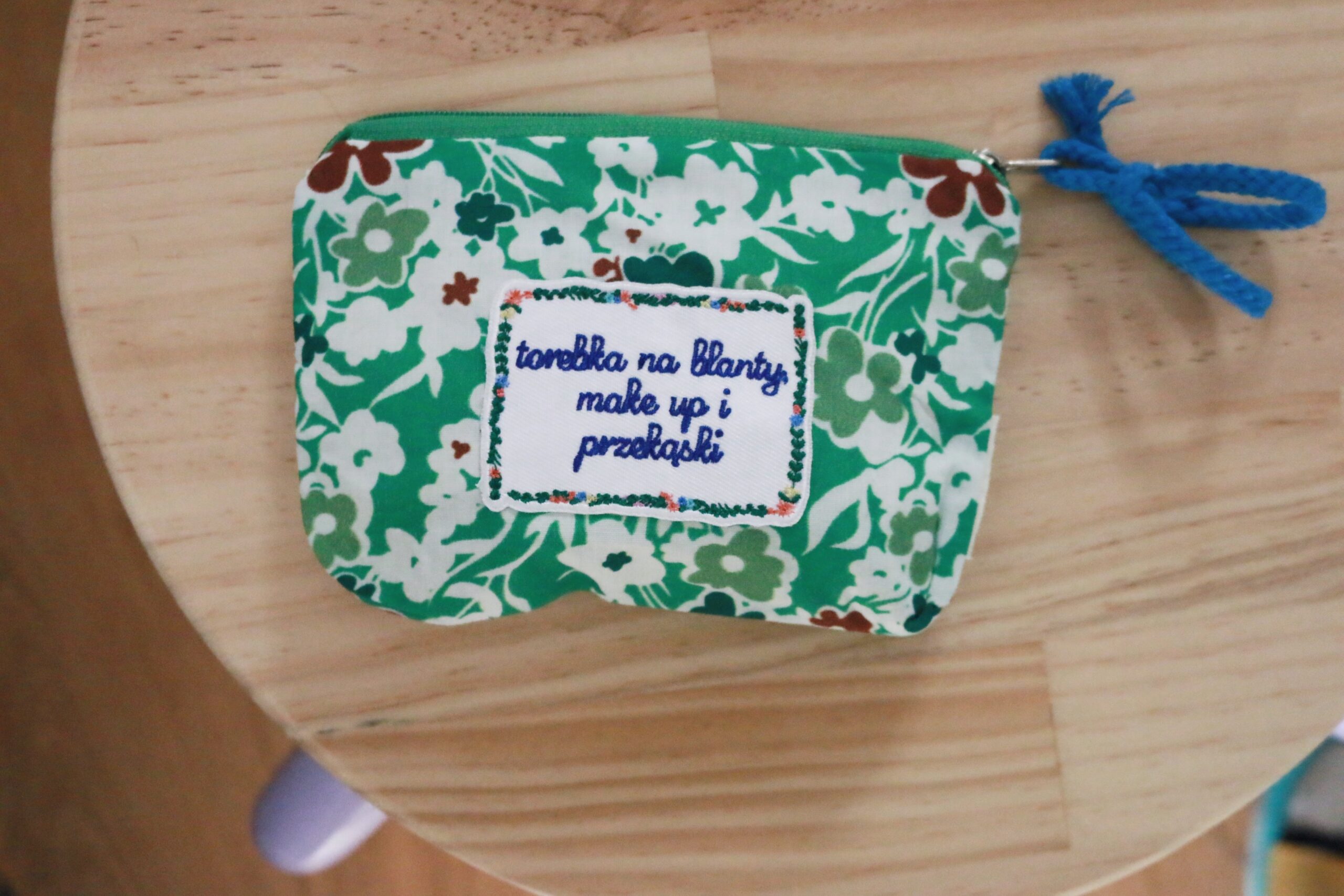 Torebka na brokat, telefon, kosmetyk, klucze i i głupoty.  Na  zameczek, pokryta łąkową tkaniną  Wymiary : szer 15,5cm x wys.12cm